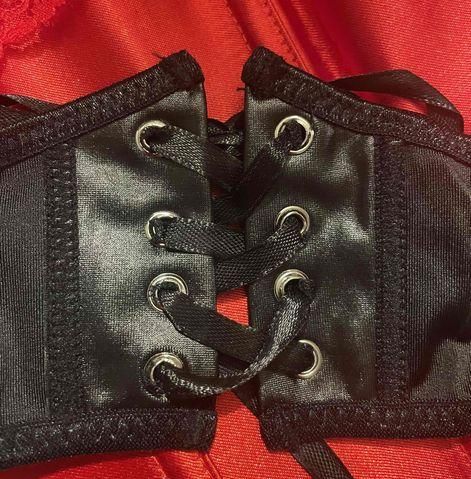 クールな赤黒xPVCのピンストライプ♪胸のラインが綺麗なショルダー&バック付アンダーバストコルセット2747mintyミンティー